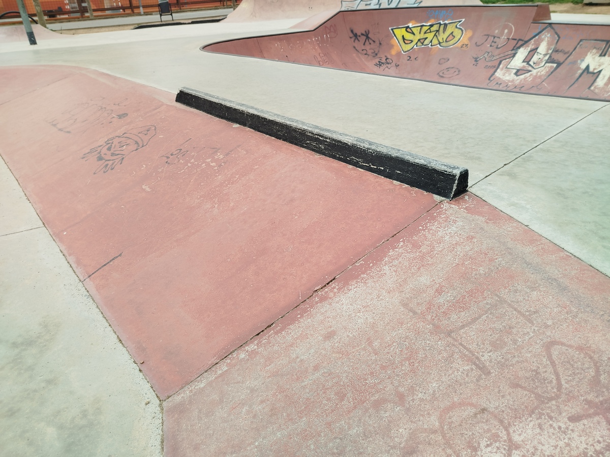 Es de cemento, muy bien hecho, se puede ver en las fotos que tiene muchos módulos para ramperos (bowls diversos, miniramps) y también tiene bastantes módulos para trucos de calle.