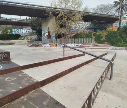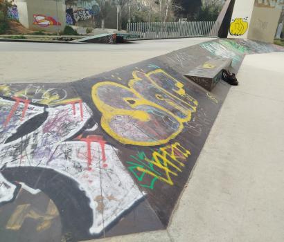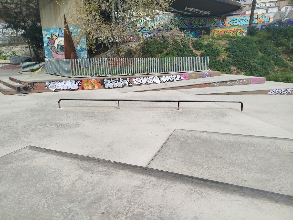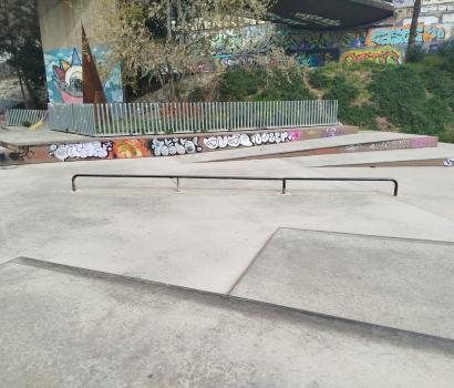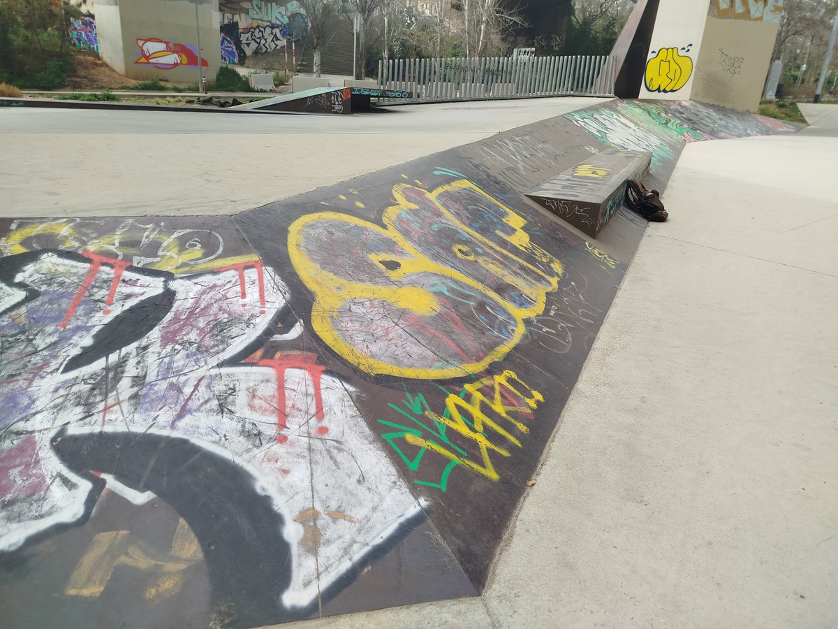 Este skateplaza tiene mogollón de módulos de street como barandillas, planos inclinados, manualeras empotradas arriba de los planos, escaleras y un cuarter pequeño pero que acaba en la pared, perfecto para hacer wallrides infinitos bajo el puente.