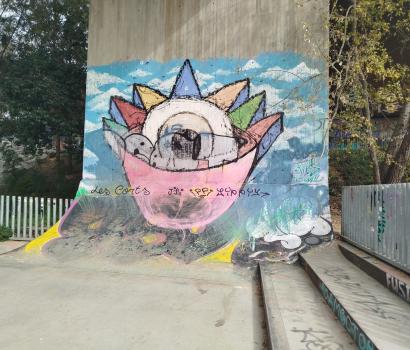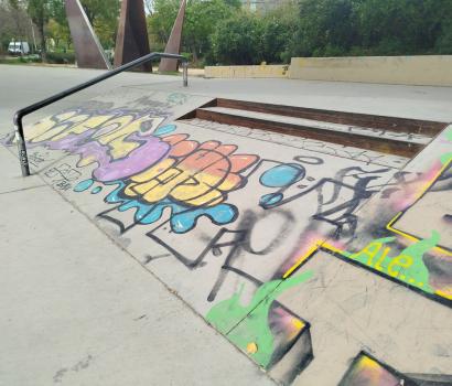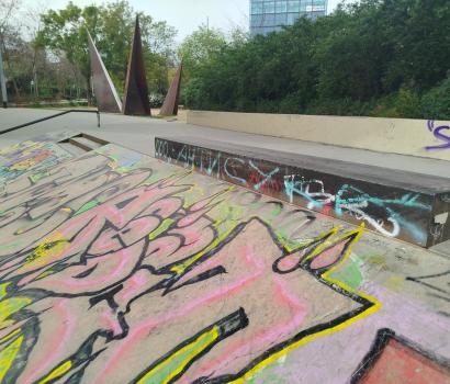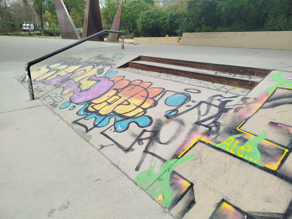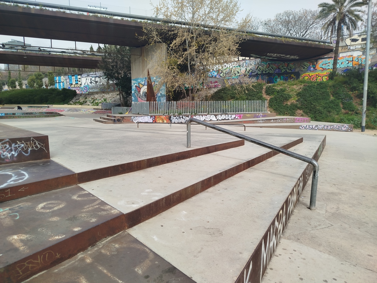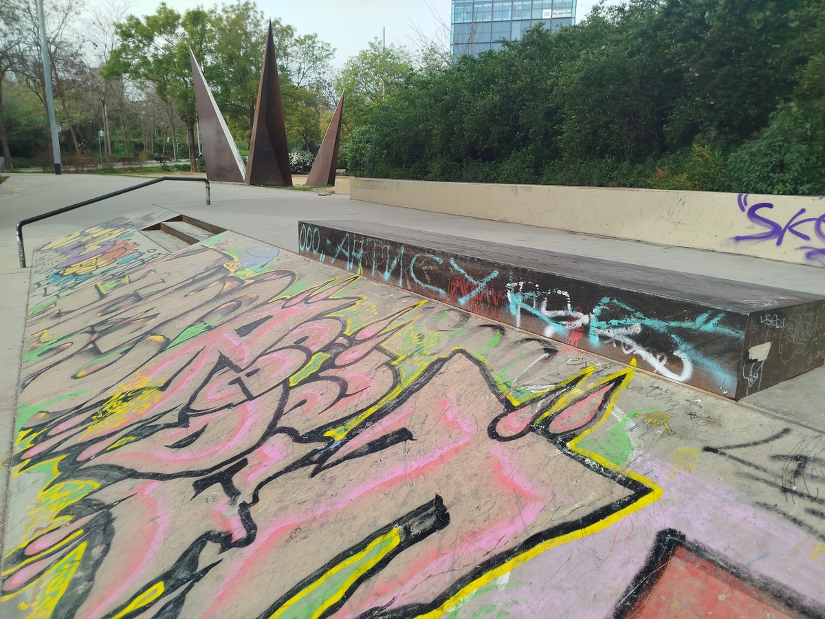 Este skateplaza tiene mogollón de módulos de street como barandillas, planos inclinados, manualeras empotradas arriba de los planos, escaleras y un cuarter pequeño pero que acaba en la pared, perfecto para hacer wallrides infinitos bajo el puente.